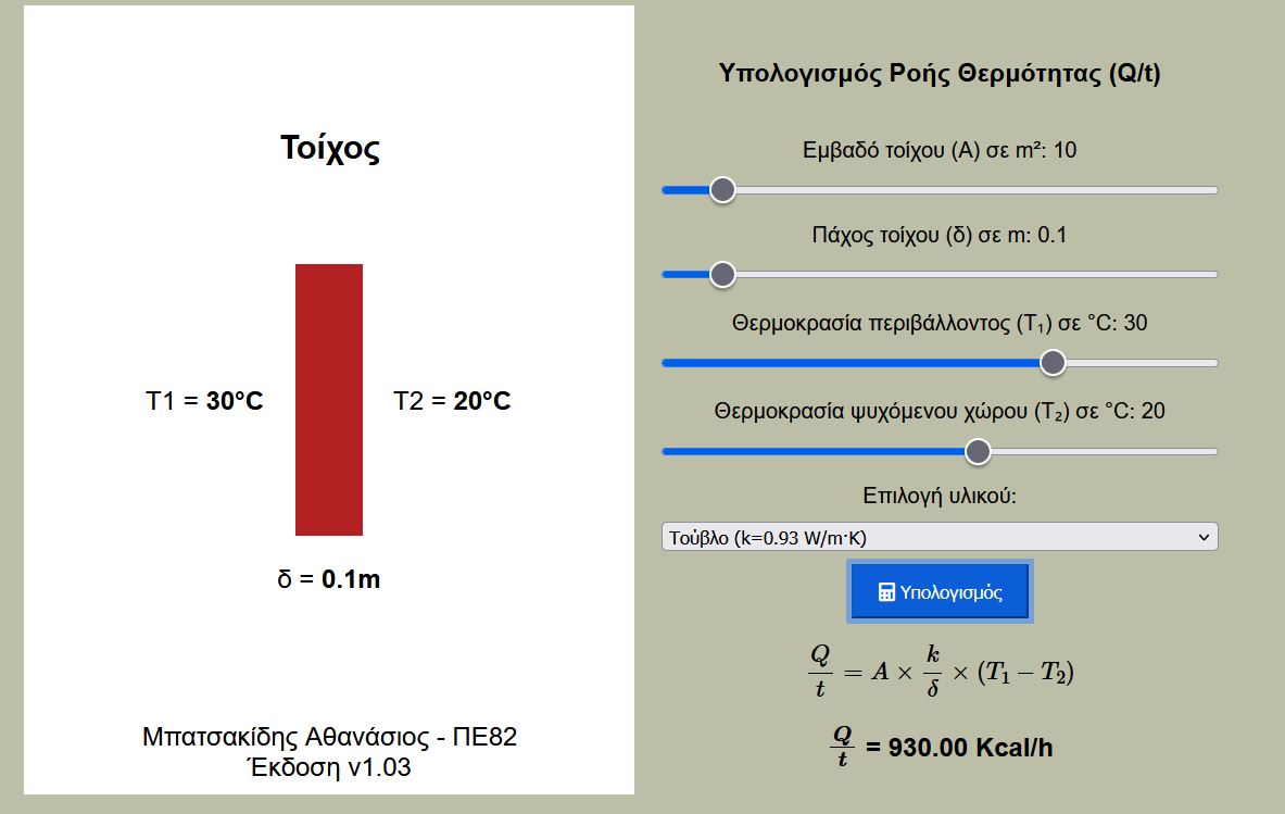 Ψηφιακό εργαλείο υπολογισμού ροής θερμότητας Q για έναν τοίχο με συγκεκριμένα χαρακτηριστικά. Κατάλληλο για την κατανόηση της εξίσωσης υπολογισμού ροής θερμότητας μέσα από παραδείγματα.
