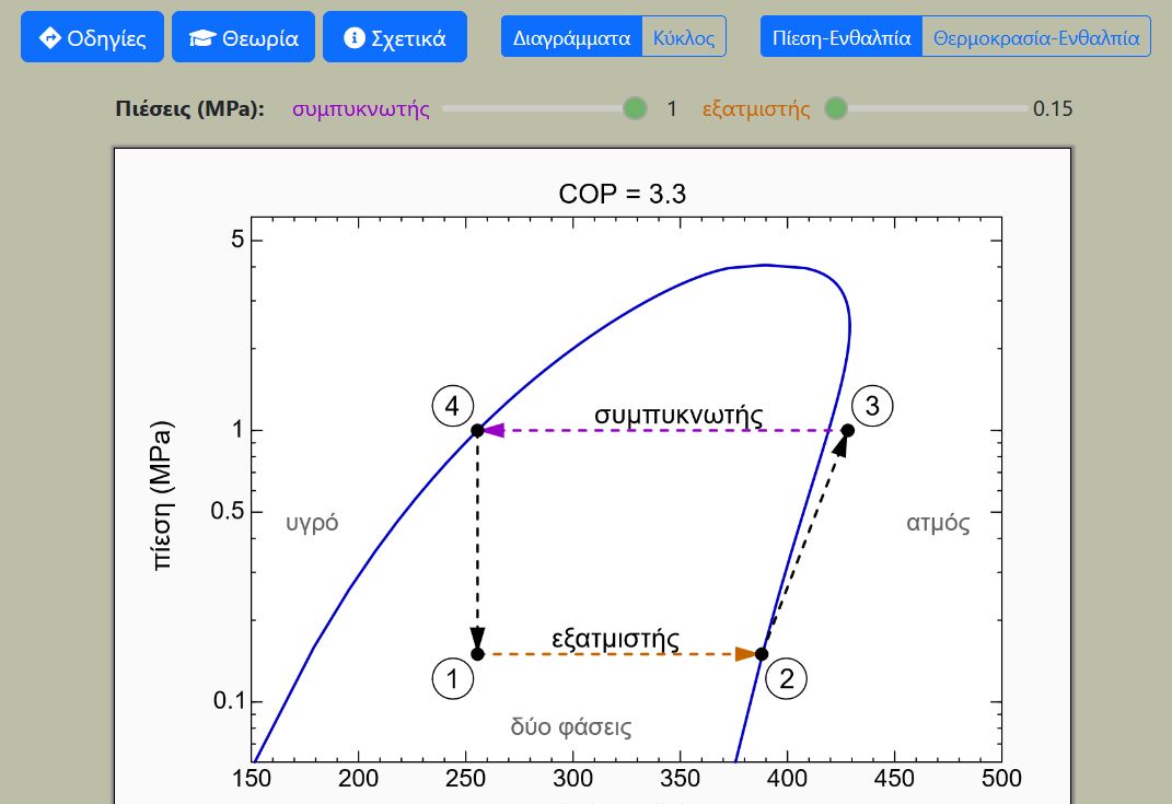 Τα διαγράμματα πίεσης-ενθαλπίας και θερμοκρασίας-εντροπίας για το ψυκτικό ρευστό R-134a χρησιμοποιούνται για την επίδειξη ενός συνηθισμένου κύκλου συμπίεσης ατμών (OVC).