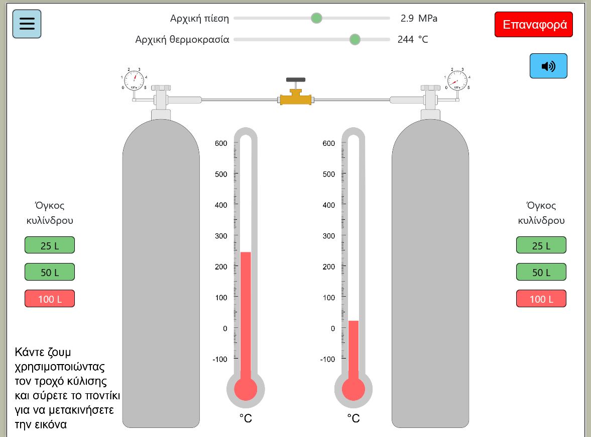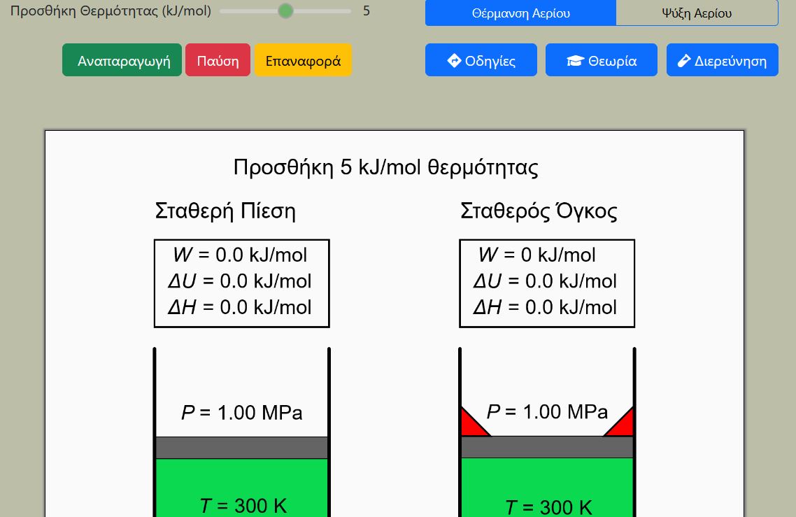 Σε αυτή την προσομοίωση, ένα ιδανικό αέριο θερμαίνεται ή ψύχεται σε δύο δοχεία, ένα με σταθερή πίεση και ένα με σταθερό όγκο.