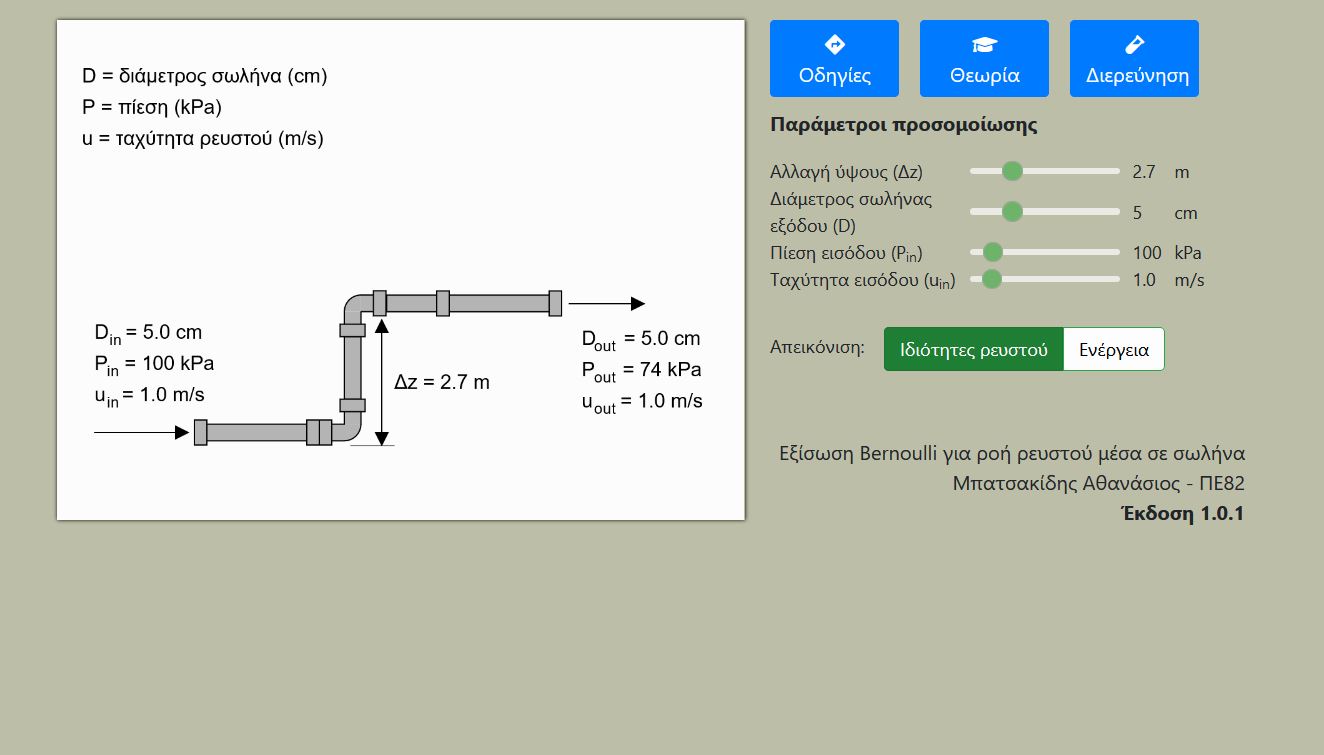 Αυτή η εφαρμογή προσομοιώνει το νερό που ρέει μέσω ενός σωλήνα με διάμετρο εισόδου Din=5 cm. Μπορείτε να ρυθμίσετε το ύψος εξόδου (Δz), τη διάμετρο του σωλήνα εξόδου (Dout), την πίεση εισόδου (Pin) και την ταχύτητα εισόδου (uin) με τη βοήθεια των μεταβολέων που βρίσκονται στην δεξιά μεριά.