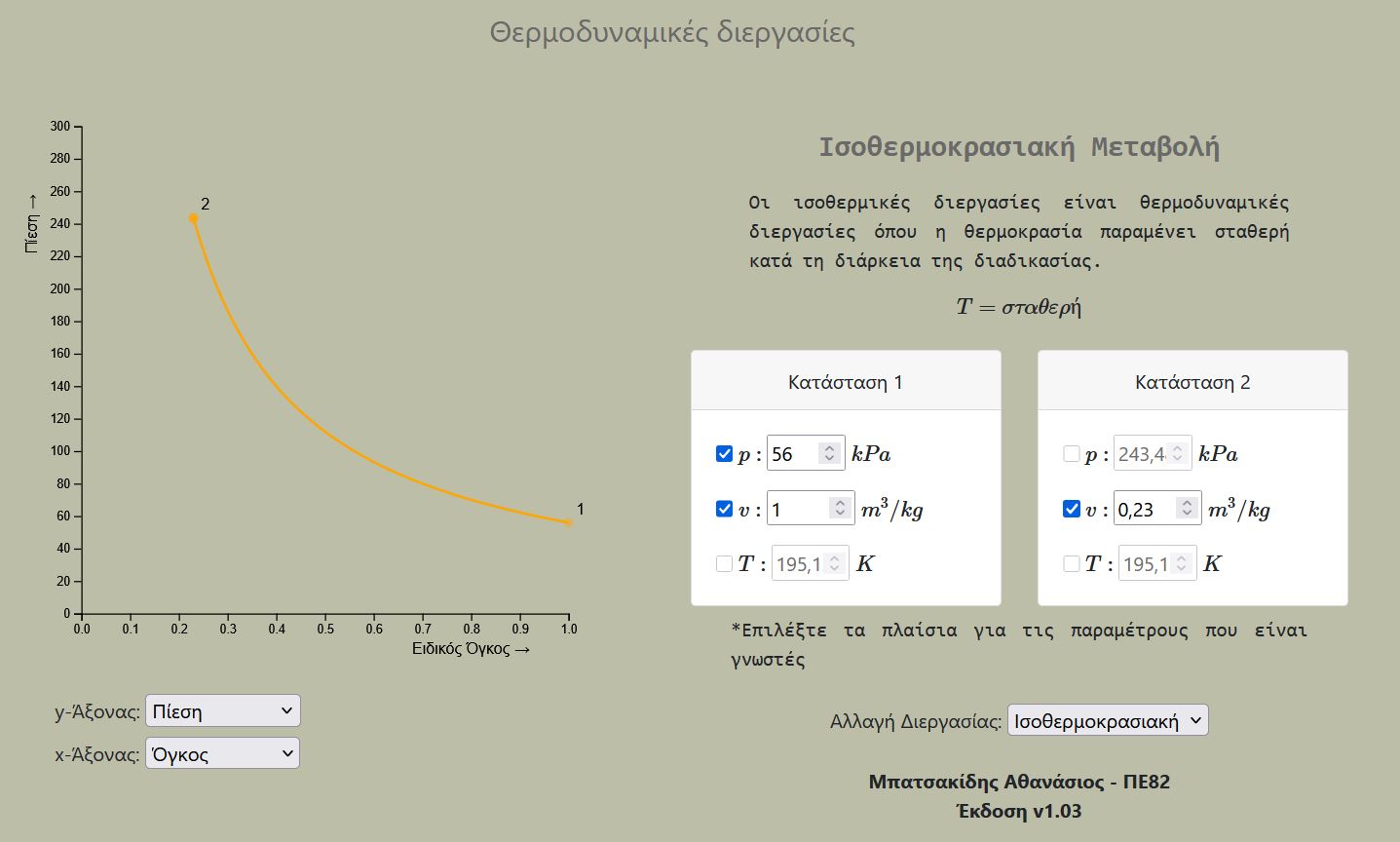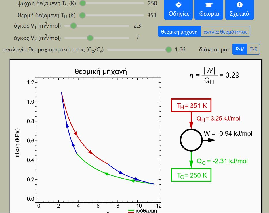 Δυναμική οπτική αναπαράσταση θερμοδυναμικών διεργασιών. Στόχος του αντικειμένου είναι να εξοικειωθεί ο χρήστης με τις τρεις θερμοδυναμικές μεταβολές