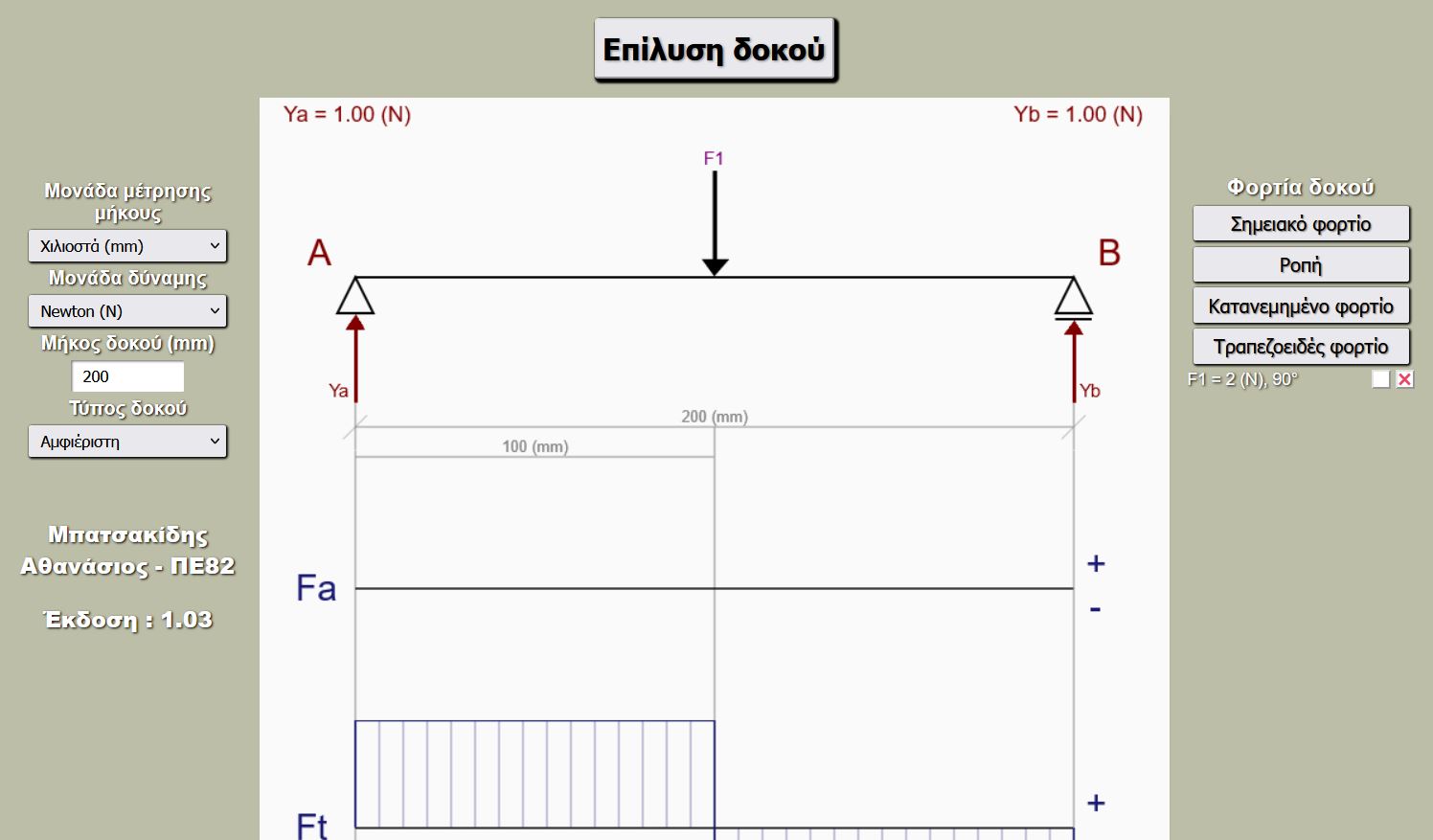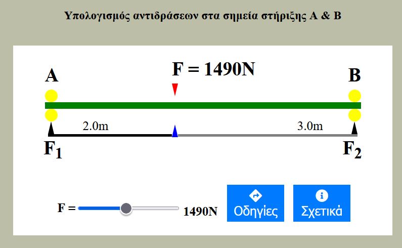 Οπτικοποίηση ράβδου (4 μέτρων) η οποία στηρίζεται σε 2 σημεία (Α και Β). Στην ράβδο επιδρά δύναμη F σε απόσταση που μπορεί να τροποποιηθεί. Επίσης το φορτίο της F είναι δυναμικό και καθορίζεται από έναν ρυθμιστή (slider).
