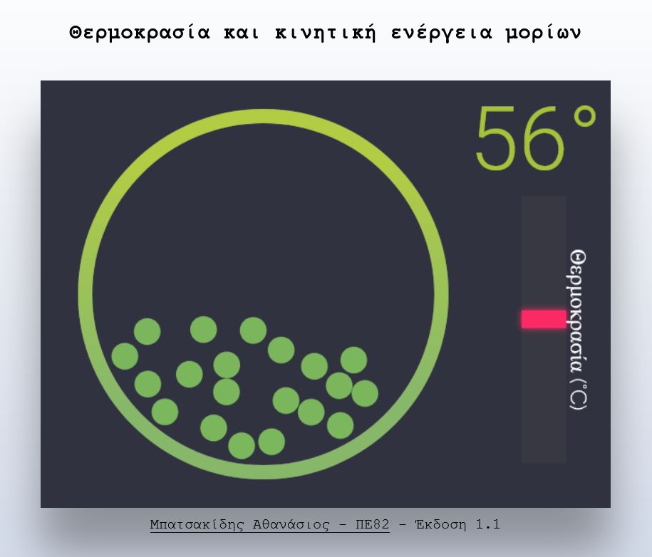 Με το μαθησιακό αυτό αντικείμενο ο μαθητής μπορεί εύκολα να κατανοήσει πώς η θερμοκρασία (αύξηση-μείωση) επηρεάζει την κινητική ενέργεια των μορίων ενός ρευστού.