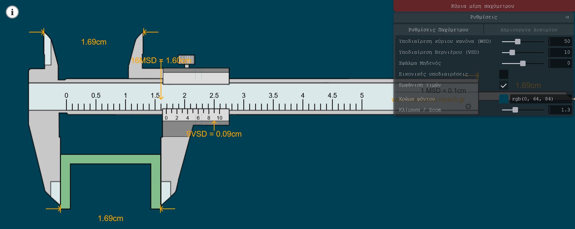Δυναμική οπτική αναπαράσταση της διαδικασίας μέτρησης εξαρτημάτων με παχύμετρο. Στόχος του αντικειμένου είναι να εξοικειωθεί ο χρήστης με τη λειτουργία του μετρητικού οργάνου.