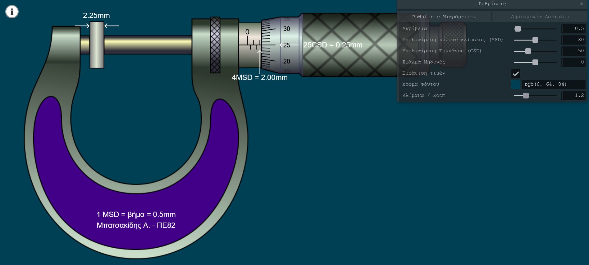 Δυναμική οπτική αναπαράσταση της διαδικασίας μέτρησης εξαρτημάτων με μικρόμετρο. Στόχος του αντικειμένου είναι να εξοικειωθεί ο χρήστης με τη λειτουργία του μετρητικού οργάνου.