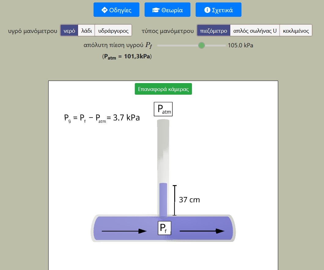 Σε αυτή την οπτικοποίηση, η πίεση ενός ρευστού μετράται χρησιμοποιώντας ένα πιεζόμετρο, ένα μανόμετρο U-tube και ένα μανόμετρο με κεκλιμένο σωλήνα.