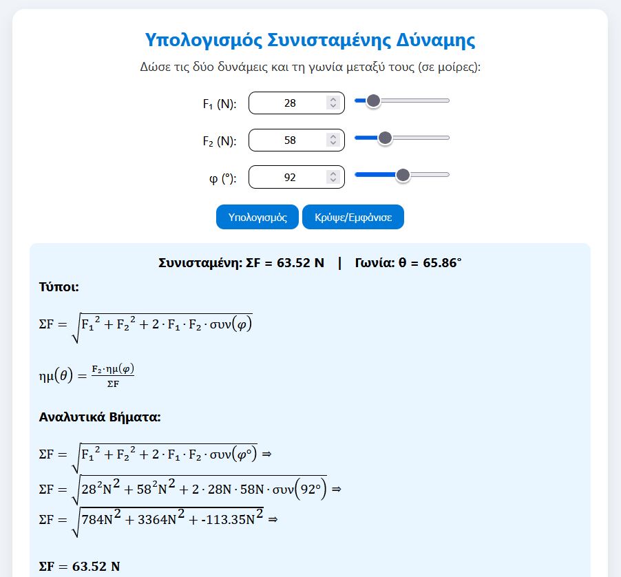 Το μαθησιακό αντικείμενο «Υπολογισμός Συνισταμένης Δύναμης» αποτελεί ένα διαδραστικό ψηφιακό εργαλείο για τη διδασκαλία εννοιών της Μηχανικής και της Αντοχής Υλικών.
